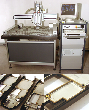Le joint profilé RFI (Form In Place) est particulièrement intéressant en raison de ses caractéristiques exceptionnelles. Le joint RFI est dosé par une buse de dosage profilée et rotative sur la surface d'étanchéité d'un boîtier en une seule opération sûre en utilisant un système de dosage X-Y-Z. Là, il durcit à température ambiante sur un joint RFI élastique conducteur. En fournissant la buse de dosage profilée et rotative, il est possible d'appliquer des joints sur les logements, qui ont une meilleure relation avec la hauteur et la largeur que les joints dosés avec une buse ronde conventionnelle. Par rapport aux joints classiques, des forces d'assemblage inférieures sont nécessaires pour obtenir la même étanchéité des logements.